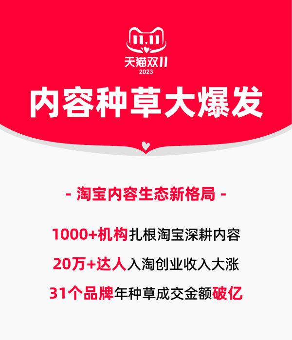 最 新數(shù)字顯示,今年已有超過20萬達(dá)人、1000家專業(yè)機(jī)構(gòu)入駐淘寶。他們帶來真實(shí)有趣的內(nèi)容,吸引更多消費(fèi)者在淘寶停留更長(zhǎng)時(shí)間。雙11以來,淘寶短視頻觀看用戶同比增長(zhǎng)142%,觀看時(shí)長(zhǎng)同比增長(zhǎng)439%,更多達(dá)人在淘寶抓住內(nèi)容化的紅利創(chuàng)業(yè),整體收入同比大漲7倍,同時(shí)已經(jīng)有31個(gè)品牌,在淘寶實(shí)現(xiàn)年種草成交金額過億。