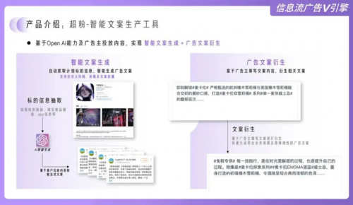 2023年是AIGC發(fā)展元年,大模型層出不窮,微博也在探索將AIGC應(yīng)用到營(yíng)銷行業(yè)。9月,微博超粉新版本上線后,廣告模型已實(shí)現(xiàn)對(duì)素材維度的識(shí)別與學(xué)習(xí),基于廣告主投放內(nèi)容,支持“智能文案生成”和“廣告文案衍生”。