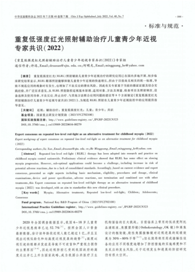 2021到2022年,教育部聯(lián)合15部門,正式提及了“紅光控制進(jìn)展”這一治療方法的試點(diǎn),同年,中山大學(xué)眼科中心和墨爾本大學(xué)眼科教授-何明光教授也在國際頂 尖雜志《Opthalmology》發(fā)表了“重復(fù)低強(qiáng)度單波長紅光控制近視進(jìn)展替代療法”一文,隨之引起行業(yè)震動(dòng)。