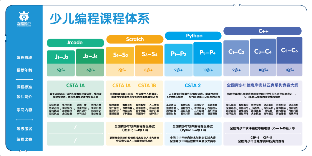 五格殿下?lián)碛幸慌鷮I(yè)的教研團隊,精心打造具有趣味性、科學性、漸進性的編程課程體系,目前開設的編程課程有Jrcode、Scratch、Python、C++四門,可以覆蓋6 - 16歲各年齡段的學習需求!