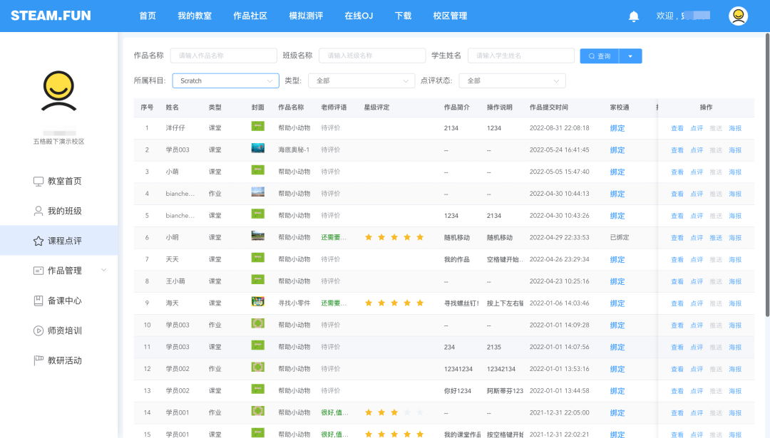 課后,老師可利用平臺上學生作品、作業(yè)點評等功能,精準掌握學生的學習情況,可以更好的為學生提供針對性的輔導,讓學生的學習效果可視化!