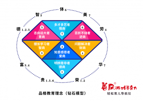 用鉆石模式來詮釋孩子的情商、逆商、意商、智商、財商、愛商和德商,讓家長明白孩子的閃光點不止一面,就像鉆石一樣任何一面都很耀眼。只要孩子具備了這些品格和能力,就會像一顆閃閃發(fā)光的鉆石,無論走到哪里都會與眾不同,都可以生存、發(fā)展并取得成功。在游戲中充分尊重孩子,利用游戲工具激發(fā)其潛能,促進其各項能力的養(yǎng)成和提升。
