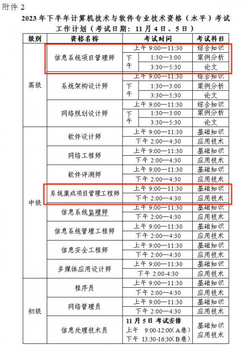 根據(jù)軟考辦發(fā)布的《關(guān)于2023年度計(jì)算機(jī)技術(shù)與軟件專(zhuān)業(yè)技術(shù)資格(水平)考試工作計(jì)劃及有關(guān)事項(xiàng)的通知》可以得知,2023年下半年軟考考試時(shí)間為11月4、5日,具體如下表所示: