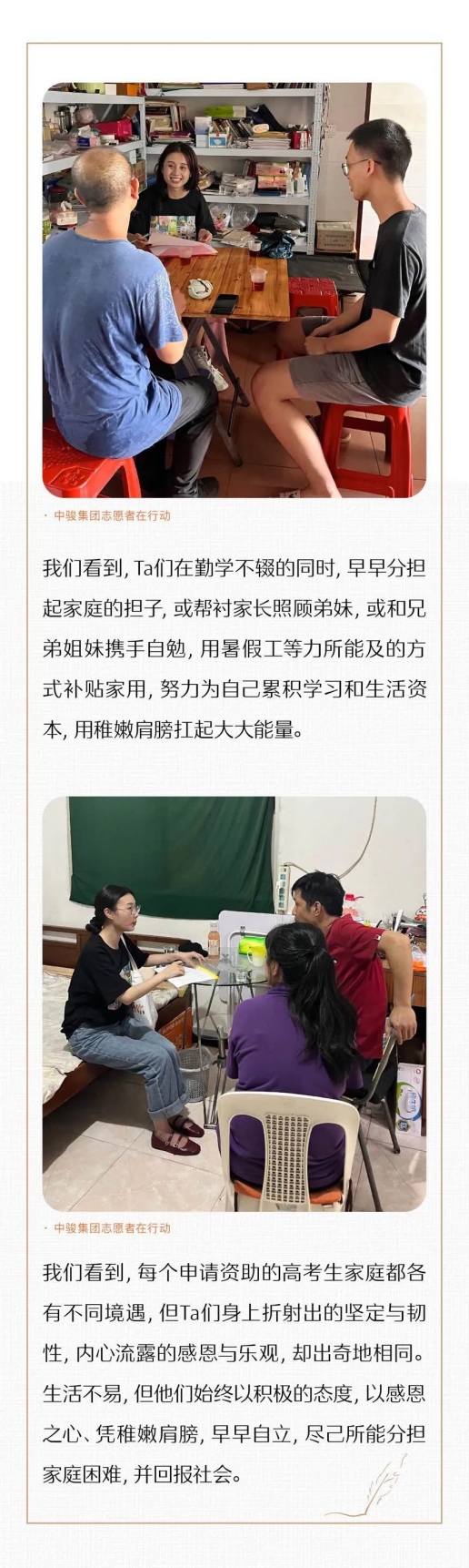 暑假期間,頂著盛夏的酷暑和肆虐的臺風(fēng),中駿集團(tuán)組織旗下住宅開發(fā)、中駿商管、長租公寓及世邦泰和的志愿者們,加入廈門教育基金會志愿者團(tuán)隊(duì),逐一探訪申報資助的學(xué)子家庭,深入了解他們的困境與需求。