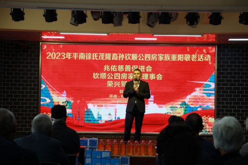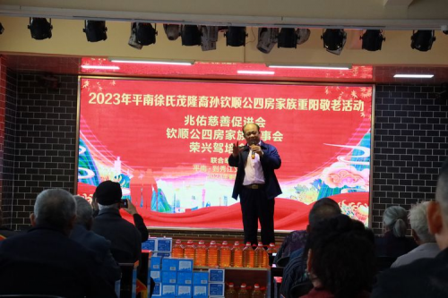 2023年10月21日上午11點(diǎn),平南縣思旺鎮(zhèn)崇秀村到秀江文化園里歡聲笑語熱鬧非凡,2023年平南徐氏茂隆裔孫欽順公(四房)家族重陽敬老活動(dòng)在這里隆重舉行,參加活動(dòng)的人員有兆佑慈善促進(jìn)會(huì)班子成員、榮興企業(yè)部份單位領(lǐng) 導(dǎo)、熱心企業(yè)家、愛心人士及受慰問的老人等共有二百多人參加。敬老節(jié)目主持人由徐家豪擔(dān)任,本次重陽敬老活動(dòng)由兆佑慈善促進(jìn)會(huì)牽頭,聯(lián)合榮興駕培企業(yè)、欽順公四房家族理事會(huì)共同舉辦,并得到了熱心人士捐款大力支持敬老活動(dòng),其目的是傳承和發(fā)揚(yáng)好中華民族傳統(tǒng)美德,為家鄉(xiāng)人民樹立起敬老愛老助老的時(shí)代道德新風(fēng)尚,為促進(jìn)社會(huì)文明、民族團(tuán)結(jié)進(jìn)步高質(zhì)量發(fā)展而共同努力。