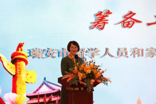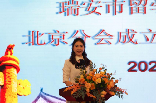 新當(dāng)選的瑞安市留學(xué)人員和家屬聯(lián)誼會(huì)北京分會(huì)第 一屆理事會(huì)洪曉瑩會(huì)長(zhǎng)代表理事會(huì)發(fā)言。