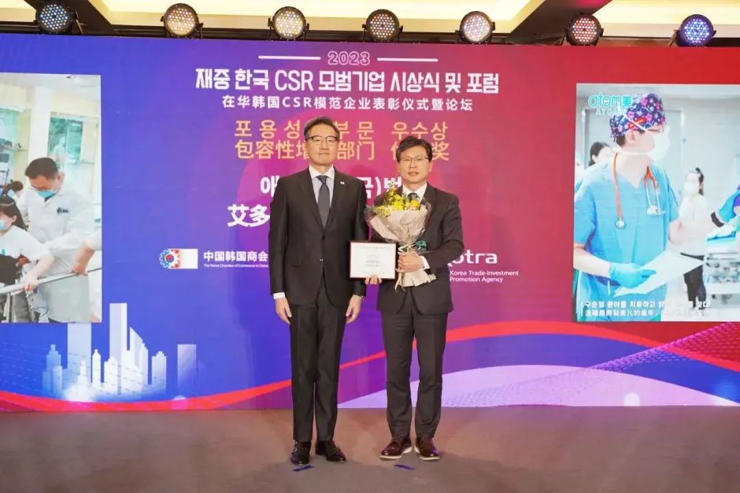 艾多美(中國)有限公司總經理樸炳寬出席“2023年第9屆在華韓國企業(yè)CSR模范企業(yè)表彰儀式暨論壇”,艾多美中國憑借在兒童、環(huán)保、教育、青少年、社會救助等方面的公益事業(yè),榮獲包容性領域“2023社會責任(CSR)模范企業(yè)”榮譽稱號。