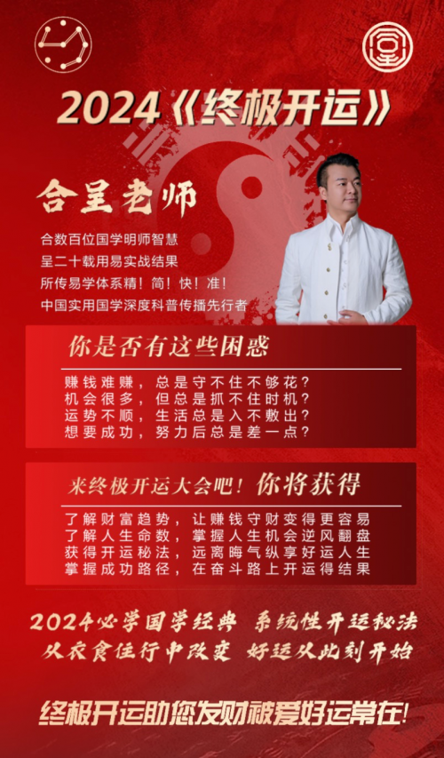 新年新氣象,2024年想要鴻運當(dāng)頭,萬事順遂,不妨從深入了解國學(xué)開始,從鉆研《易經(jīng)》開始,從“終極開運”系列課程開始。讓我們在主講老師——合呈老師的帶領(lǐng)下,了解傳統(tǒng)文化,取其精華,去其糟粕,化繁為簡,推陳出新,用現(xiàn)代科學(xué)思維,實現(xiàn)個人更好的發(fā)展。