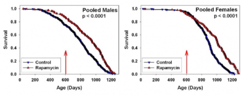 2009年《自然》期刊發(fā)表的文章顯示,從小鼠9個(gè)月大(相當(dāng)于人類30-35歲)時(shí)喂食雷帕霉素,可使雌性小鼠壽命延長14%,雄性小鼠壽命延長9%。這是首個(gè)證實(shí)服用雷帕霉素可延長實(shí)驗(yàn)動(dòng)物壽命的研究。而后續(xù)的研究證實(shí),雷帕霉素還可改善實(shí)驗(yàn)動(dòng)物的認(rèn)知下降、心血管功能障礙等。