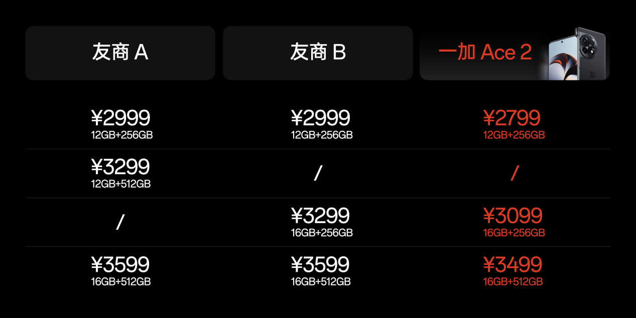 一加 Ace 2 16GB + 256GB 版本,售價3099元;