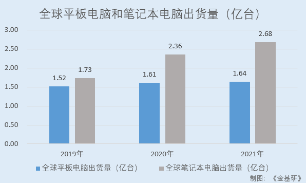 據Counterpoint數據,2019-2021年,全球平板電腦出貨量分別為1.52億臺、1.61億臺、1.64億臺;據Canalys數據,2019-2021年,全球筆記本電腦出貨量分別為1.73億臺、2.36億臺、2.68億臺。