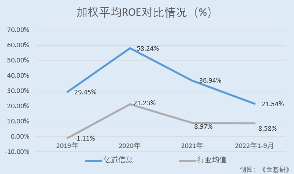 經金基研計算,2019-2021年及2022年1-9月,上述五家億道信息同行業(yè)可比公司的加權平均ROE均值分別為-1.11%、21.23%、8.97%、8.58%。