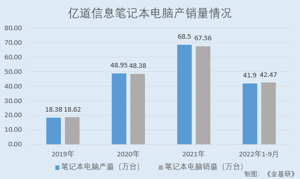 據招股書,2019-2021年及2022年1-9月,億道信息筆記本電腦的產量分別為18.38萬臺、48.95萬臺、68.50萬臺、41.90萬臺;銷量分別為18.62萬臺、48.38萬臺、67.56萬臺、42.47萬臺,產銷率分別為101.29%、98.84%、98.62%、101.37%。