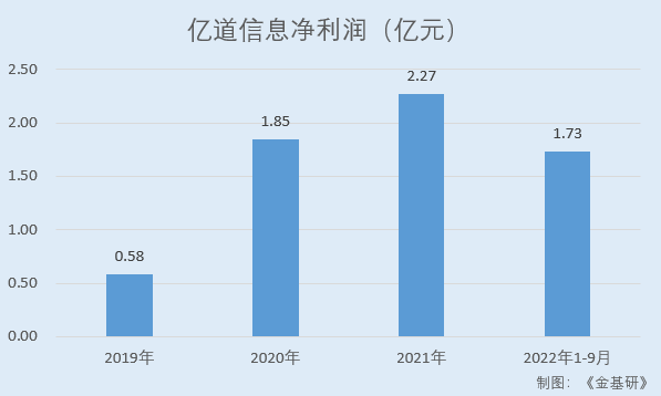 同期,億道信息實現凈利潤分別為0.58億元、1.85億元、2.27億元、1.73億元。