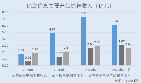 其中,2019-2021年及2022年1-9月,億道信息筆記本電腦銷售收入分別為1.72億元、4.87億元、7.35億元、6.14億元,占主營業(yè)務收入的比例分別為16.74%、26.62%、22.61%、29.98%;平板電腦銷售收入分別為0.62億元、1.25億元、2.65億元、3.07億元,占主營業(yè)務收入的比例分別為6.02%、6.82%、8.14%、15.01%;三防類電子產品銷售收入分別為1.86億元、2.10億元、2.94億元、2.63億元,占主營業(yè)務收入的比例分別為18.11%、11.46%、9.03%、12.86%。
