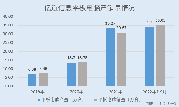 同期,億道信息平板電腦的產量分別為6.98萬臺、13.70萬臺、33.27萬臺、34.05萬臺,銷量分別為7.49萬臺、13.73萬臺、30.67萬臺、35.09萬臺,產銷率分別為107.32%、100.23%、92.18%、103.07%。