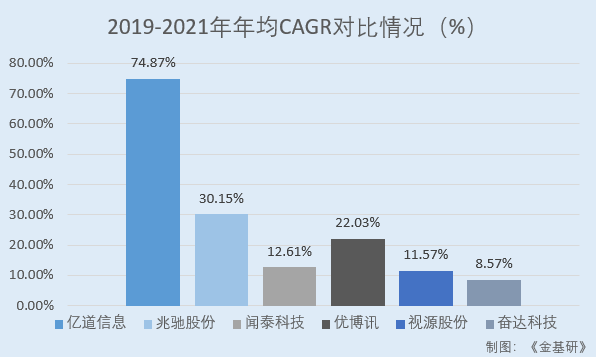 值得一提的是,營業(yè)收入增長率是評價企業(yè)成長狀況和發(fā)展能力的重要指標,而億道信息2019-2021年營業(yè)收入復合增長率“領跑”同行,凸顯其成長性。