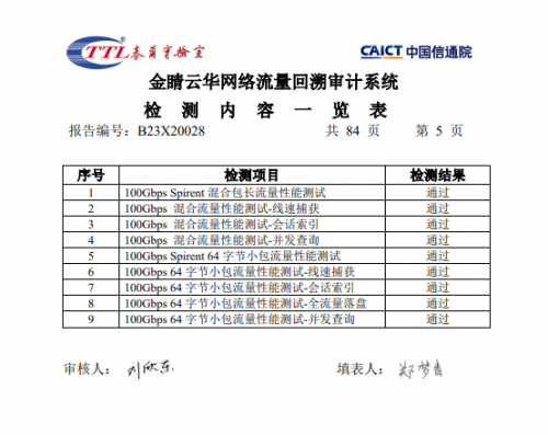 2023年1月5日,北京金睛云華科技有限公司(以下簡稱“金睛云華”)發(fā)布了全球第 一款基于通用服務(wù)器硬件的100Gbps線速64字節(jié)全包捕獲、存儲、索引和溯源取證類產(chǎn)品——網(wǎng)絡(luò)流量回溯審計系統(tǒng)(又名:全流量威脅取證系統(tǒng),簡稱TFS),其以多方面優(yōu)異的性能,順利通過了中國信息通信研究院的泰爾實驗室(以下簡稱“泰爾實驗室”)官方檢測,并獲得了權(quán) 威檢測報告。此次檢測內(nèi)容涵蓋100Gbps 混合包長流量測試、100Gbps 64字節(jié)小包流量測試、10萬QPS(Queries per second)會話并發(fā)查詢測試和高并發(fā)PCAP下載測試等。