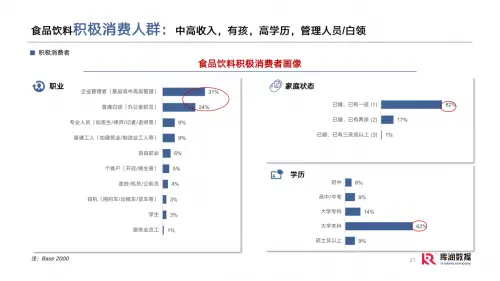 關(guān)于食品飲料,當(dāng)前中國(guó)消費(fèi)者普遍較為理性,青睞無(wú)添加食品,關(guān)注成分、健康和營(yíng)養(yǎng)。其中中年人的消費(fèi)狀況比較穩(wěn)定,品牌可以針對(duì)年輕人挖掘增量,創(chuàng)造年輕一代喜愛(ài)的產(chǎn)品,并針對(duì)性營(yíng)銷(xiāo)宣傳,抓住市場(chǎng)占有率與機(jī)會(huì)。