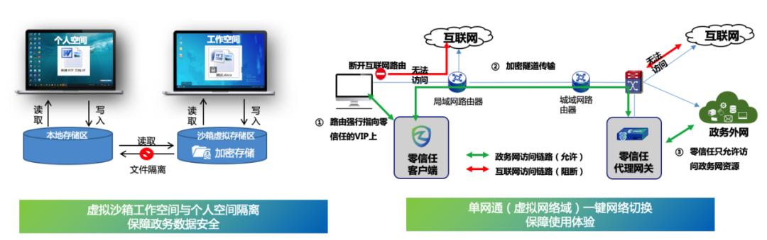 深信服政務(wù)終端零信任方案,結(jié)合電子政務(wù)網(wǎng)絡(luò)特點(diǎn),充分考慮終端安全管理、權(quán)責(zé)分離等難點(diǎn),在切實(shí)解決“一機(jī)兩網(wǎng)”“違規(guī)外聯(lián)”“移動(dòng)接入”等安全風(fēng)險(xiǎn)的基礎(chǔ)上,兼顧保障用戶業(yè)務(wù)使用體驗(yàn)。在多網(wǎng)分時(shí)訪問(wèn)、數(shù)據(jù)安全等政務(wù)終端管控需求,運(yùn)用安全沙箱技術(shù),提供“單網(wǎng)通”、“政務(wù)工作空間”等功能,不斷打磨、提升零信任產(chǎn)品能力,為數(shù)字政 府終端安全接入提供有效保障,目前已在全國(guó)超30家數(shù)字政 府完成零信任的落地實(shí)踐。