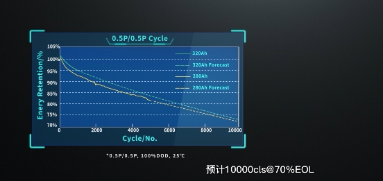 性能兼容:海辰320Ah電池根據(jù)可靠性模型預(yù)計(jì)循環(huán)至70%EOL可達(dá)10000次,已于2023年3月取得GB/T36276認(rèn)證。