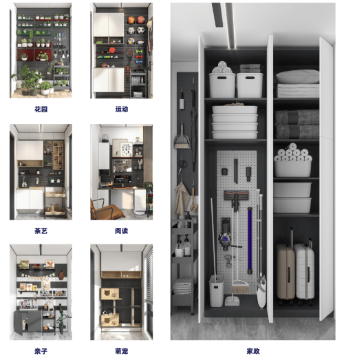 此外,基于“收納更極致、場(chǎng)景更自由、安裝更高效”的陽臺(tái)整體解決方案,集成陽臺(tái)還實(shí)現(xiàn)立體收納、10cm極窄收納和75mm可調(diào)節(jié)收納,滿足不同物品的擺放需求,做到不浪費(fèi)每一寸空間,將空間收納做到極致。