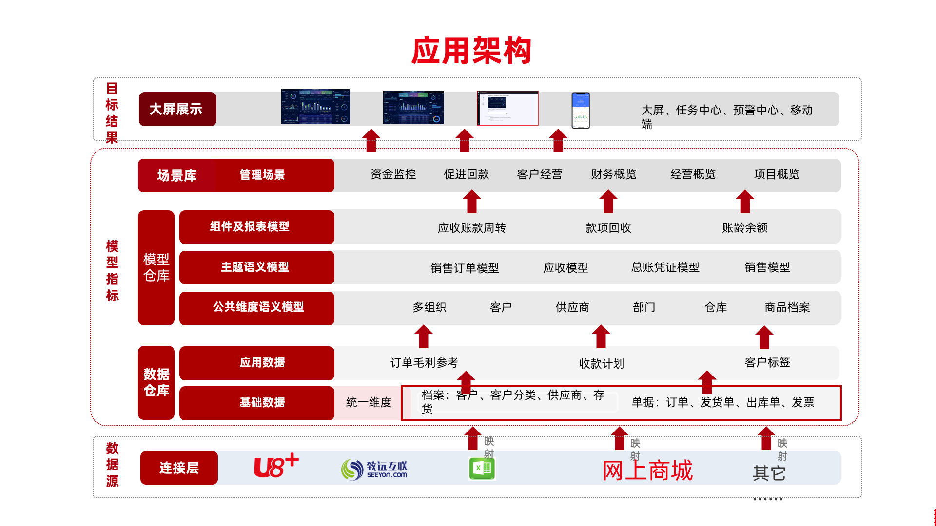 整個實施過程也是極其便捷的。第 一步,通過抓取U8+、OA、網(wǎng)上商城等系統(tǒng)的數(shù)據(jù),形成客戶、供應(yīng)商、存貨、單據(jù)類等基礎(chǔ)數(shù)據(jù),并進一步轉(zhuǎn)化為應(yīng)用數(shù)據(jù);第二步,根據(jù)模型倉庫中的多組織模型、銷售訂單模型或報表模型等,搭建國洋自身需求的模型指標,并計算出結(jié)果,最終通過大屏、預(yù)警中心、移動端等呈現(xiàn)到管理者面前。