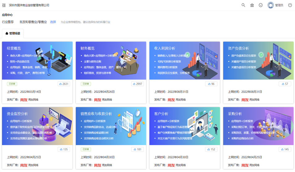 首先,企業(yè)基本實現(xiàn)了基于U8+的跨單據(jù)、跨模塊、跨年度的多主體、多維度、可視化的數(shù)據(jù)展現(xiàn)。其次,基于良好的擴展能力,數(shù)據(jù)應(yīng)用服務(wù)幫助國洋實現(xiàn)異構(gòu)系統(tǒng)的數(shù)據(jù)抽取、整合等,從而滿足全量的數(shù)據(jù)分析需求。第三,通過構(gòu)建可視化的大屏,國洋實現(xiàn)了對于重點業(yè)務(wù)的分析和指標的智能化預(yù)警,實時監(jiān)控業(yè)務(wù)數(shù)據(jù)的偏差,讓數(shù)據(jù)真正發(fā)揮業(yè)務(wù)價值。第四,數(shù)據(jù)應(yīng)用服務(wù)提供了組裝式的大屏設(shè)計能力,業(yè)務(wù)人員通過簡單的拖拉拽就可以實現(xiàn)對角色大屏的管理,以滿足不同業(yè)務(wù)角色的分析需求。第五,用友線上應(yīng)用商城提供了多種管理場景,這是對數(shù)據(jù)應(yīng)用服務(wù)好的補充。國洋可按需檢索、自行下載即可獲得更多的業(yè)務(wù)分析模型,更加精準的解決管理痛點。