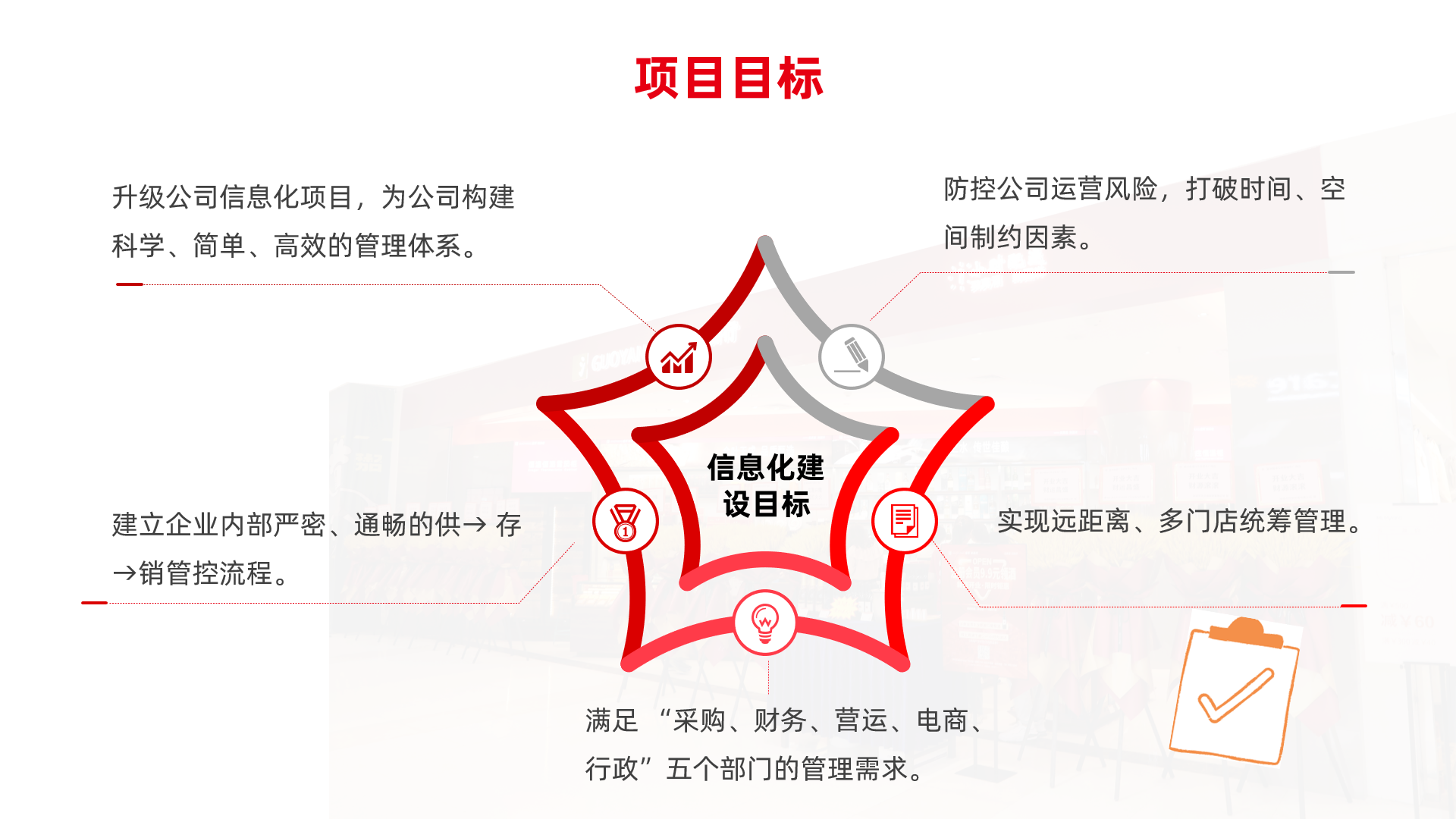 在這樣的窘境下,付國銀對企業(yè)數(shù)智化需求重新進行了梳理和盤點,并制定了五大建設(shè)目標,即通過數(shù)智化平臺的建設(shè),滿足采購、財務(wù)、電商、行政等部門管理訴求;規(guī)范業(yè)務(wù)管理,建立標準化、一體化的供、存、銷管理流程;實現(xiàn)對所有門店的集中管控;加強移動化應(yīng)用,打造全面高效的決策支持體系,提高管理者的決策效率和準確率;為企業(yè)構(gòu)建科學(xué)、有效的管理體系。