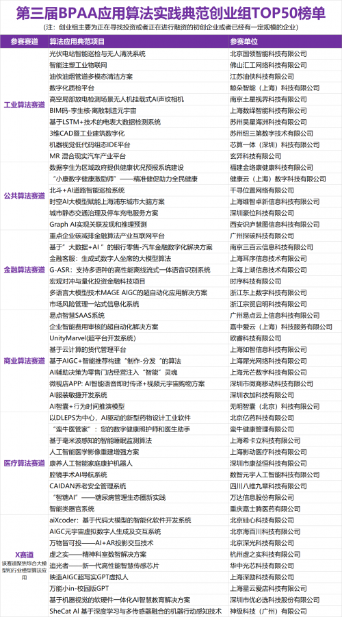 本屆BPAA大賽中,各算法項目團隊除了在原有的公共算法、金融算法、醫(yī)療算法、工業(yè)算法、商業(yè)算法五大賽道開展角逐,更特設聚焦大模型和行業(yè)模型算法應用的X賽道。同時,本屆大賽在前兩屆基礎上設置了創(chuàng)新、創(chuàng)業(yè)兩個參賽組別,為更多算法項目和團隊提供展現自我和落地機會。