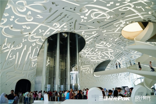 未來博物館由肖恩·基拉設(shè)計,用創(chuàng)新而獨特的建筑語言再次刷新了當代建筑的“奇跡”,是世界上最復(fù)雜的建筑之一。整體呈立體環(huán)形結(jié)構(gòu),外立面由1024塊機器人打印的阿拉伯書法版塊拼接而成,創(chuàng)造出獨一無二具有阿拉伯文化的美學(xué)效果。內(nèi)部共分為7層,涵蓋5個章節(jié),展現(xiàn)對未來的探索。從外到內(nèi),流動的點、線、面結(jié)合奇特的造型,賦予建筑神秘、科幻的視覺感受。