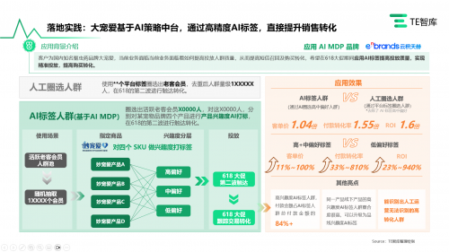 大寵愛是國內(nèi)知名的驅(qū)蟲藥品牌,618期間需要提高投放人群購買轉(zhuǎn)化。云積天赫基于自研產(chǎn)品“AI策略中臺”(AI MDP),全選出高質(zhì)量的AI標(biāo)簽人群,對應(yīng)到高轉(zhuǎn)化產(chǎn)品。實(shí)踐證明,AI標(biāo)簽人群對比人工圈選人群在客單價、付款轉(zhuǎn)化率和ROI上均有顯著提升。