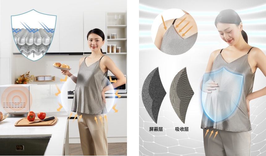 雙層防護(hù):外層銀離子面料能有效屏蔽電磁波,內(nèi)層吸收輻射面料將逸散進(jìn)來的電磁輻射吸收轉(zhuǎn)化為安全的能量;