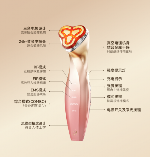 珮肌玉如意集合RF射頻、EIP導入電脈沖、EMS微電流、LED光于一體,可以實現(xiàn)提拉緊致+全臉抗衰+眼周呵護+淡化皺紋+光澤肌膚等全方位護理,滿足大部分用戶的保養(yǎng)需求。