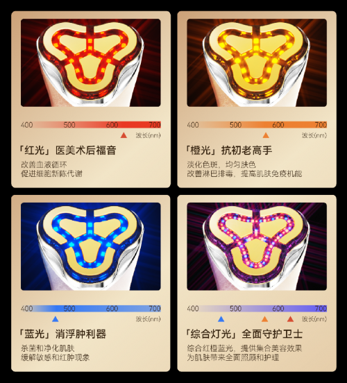 比如波長較長的紅光可以穿透真皮層,促進血液循環(huán)、皮膚細胞新陳代謝;藍光可以消炎殺菌,精華肌膚,緩解皮膚敏感和紅腫現(xiàn)象;橙光可以淡化色斑,均勻膚色,提高肌膚免疫機能。