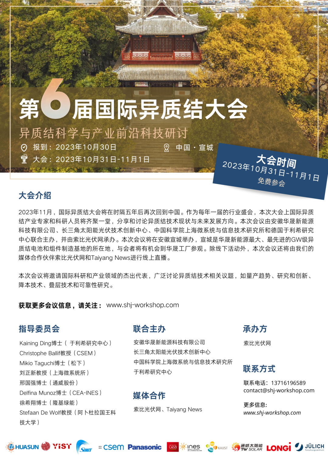 2023年10月31日至11月1日,第六屆國際硅異質(zhì)結(jié)研討會(huì)將來到中國異質(zhì)結(jié)光伏之都——安徽省宣城市。本次會(huì)議由全球領(lǐng) 先的異質(zhì)結(jié)垂直一體化產(chǎn)品與解決方案提供商安徽華晟新能源科技有限公司與長三角太陽能光伏技術(shù)創(chuàng)新中心、中國科學(xué)院上海微系統(tǒng)與信息技術(shù)研究所、德國于利希研究中心聯(lián)合主辦,索比網(wǎng)承辦。