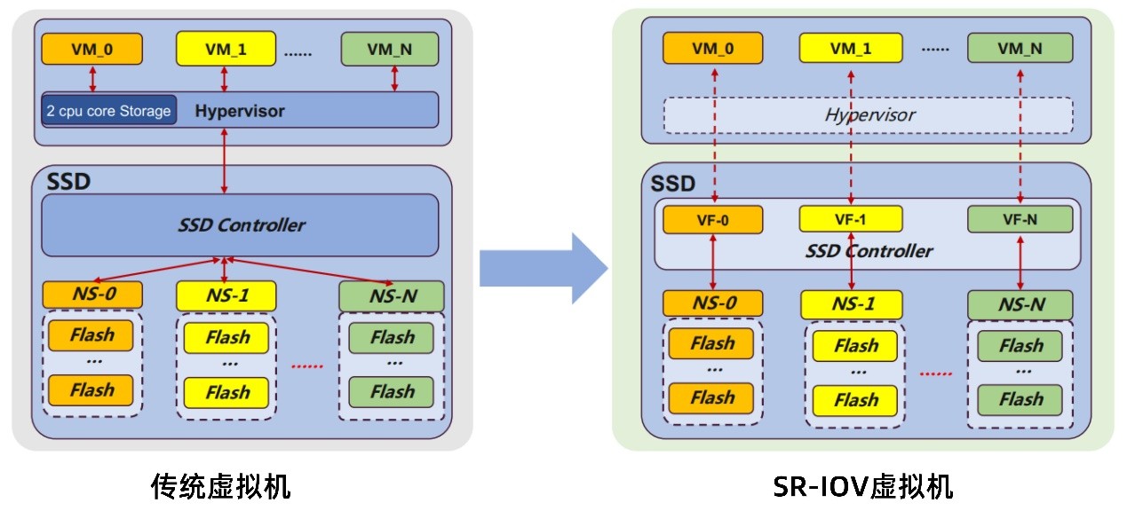 圖1:傳統(tǒng)虛擬機(jī)與SR-IOV虛擬機(jī)對(duì)比
