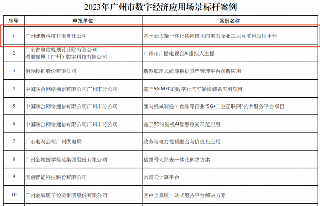 近日,廣州市工業(yè)和信息化局公布了“2023年廣州市數(shù)字經(jīng)濟(jì)應(yīng)用場(chǎng)景標(biāo)桿案例”,健新科技“基于云邊端一體化協(xié)同技術(shù)的電力企業(yè)互聯(lián)網(wǎng)應(yīng)用平臺(tái)”憑借在電力行業(yè)數(shù)字化轉(zhuǎn)型中的引領(lǐng)作用和成熟應(yīng)用模式,成功通過部門推薦和專家評(píng)審,預(yù)期未來將在技術(shù)創(chuàng)新、供需對(duì)接、宣傳推廣等方面獲得更大的支持力度,更好推動(dòng)數(shù)字技術(shù)與實(shí)體經(jīng)濟(jì)深度融合。