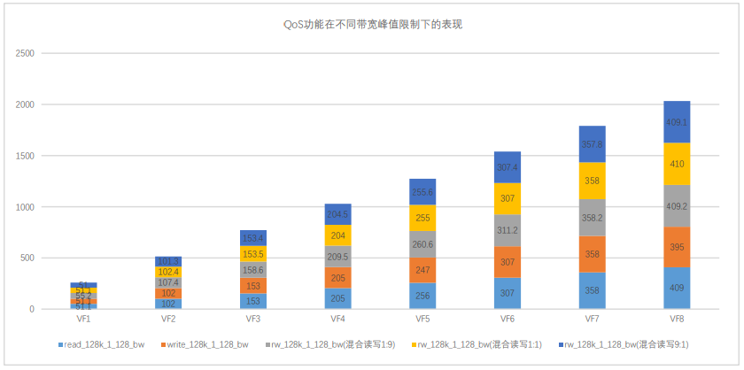圖 2:QoS 功能在對不同 VF 設(shè)置不同流量限制下的帶寬及 IOPS 表現(xiàn)