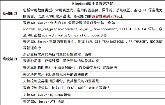 KingbaseES以內核兼容為基礎,通過初始化參數控制,兼容SQL Server數據庫,在該模式下支持SQL Server常用功能,兼容程度達90%以上。