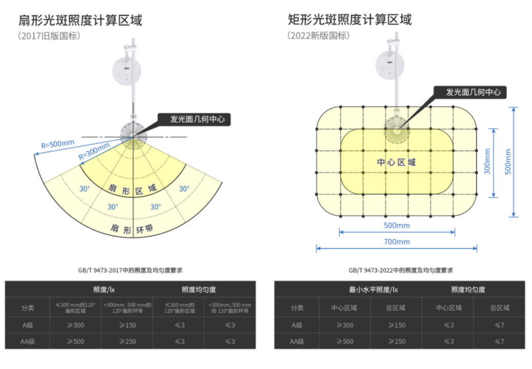 2022新版照度均勻度面積約為0.35m2,呈矩形,更符合真實(shí)使用場景,比舊版國測量面積增加了35%左右。