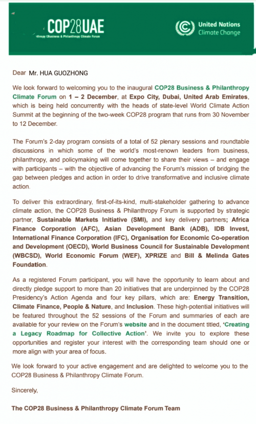 據(jù)相關(guān)媒體綜合報(bào)道: 2023年11月30日至12月12日,第28屆聯(lián)合國(guó)氣候變化大會(huì)在迪拜世博城舉行。人類健康組織大中華區(qū)主 席華國(guó)中將應(yīng)主辦方邀請(qǐng)前往聯(lián)合國(guó)氣候變化大會(huì)舉辦地迪拜“世博城”參加盛會(huì)。