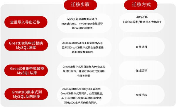 針對(duì)全量導(dǎo)入導(dǎo)出、MySQL源庫(kù)、MySQL從庫(kù)、MySQL反向同步4類(lèi)客戶(hù)常見(jiàn)的應(yīng)用場(chǎng)景,萬(wàn)里數(shù)據(jù)庫(kù)給出了4類(lèi)不同的遷移步驟以及相匹配的遷移方式。