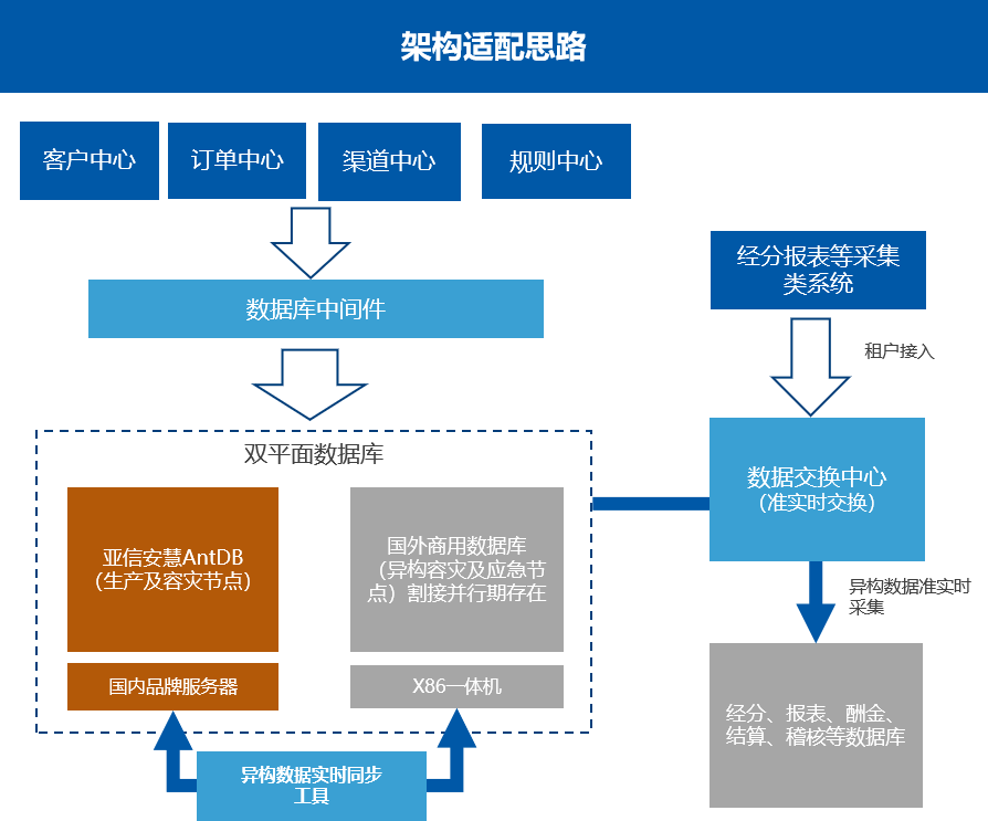 架構(gòu)適配將應(yīng)用系統(tǒng)和數(shù)據(jù)庫之間、庫和庫之間多樣化的交互方式收斂到統(tǒng)一的數(shù)據(jù)庫中間件、數(shù)據(jù)庫交換中心及實(shí)時(shí)同步工具三大組件,減少后續(xù)換庫改造成本;