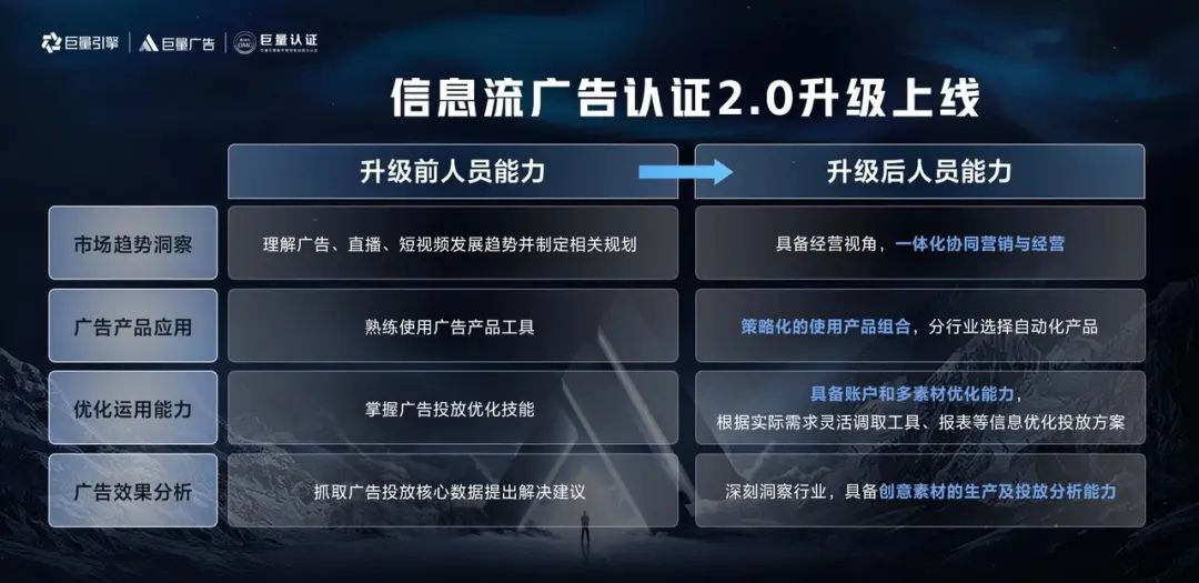 巨量廣告升級版作為巨量引擎下一代創(chuàng)意型自動化投放平臺,用創(chuàng)意驅(qū)動生意、讓自動提升效益、用極簡推動普惠、讓廣告深入經(jīng)營,實現(xiàn)更確定的營銷信息流與生意增長,助力經(jīng)營者長效增長,實現(xiàn)平臺、用戶、廣告主三方共贏。隨著巨量廣告升級版全量上線,行業(yè)從業(yè)者需要深刻理解巨量廣告升級版的發(fā)展方向,迭代個人能力適應(yīng)行業(yè)發(fā)展的趨勢。作為巨量廣告升級版GTM用戶教育的關(guān)鍵一環(huán),巨量認(rèn)證正式上線“信息流廣告初中級認(rèn)證2.0版”。新內(nèi)容升級前后,對人才能力提出不同要求;