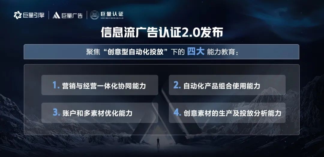 巨量廣告升級版全量上線,對數(shù)字營銷從業(yè)者提出更高能力要求,信息流廣告認(rèn)證2.0升級聚焦升級版核心,以系統(tǒng)、專業(yè)的人才認(rèn)證培育體系,幫助從業(yè)者緊跟平臺步伐,迭代自身能力,更好幫助廣告主實現(xiàn)更確定的營銷信息流與生意增長,實現(xiàn)自身價值。