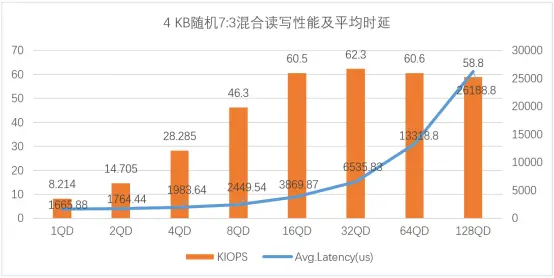如圖4所示,在4KB隨機(jī)7:3混合讀寫性能場景中,UH711a在32QD及以下更具優(yōu)勢,IOPS峰值在32QD時可達(dá)62.3K,對應(yīng)平均時延為6535.83 us(6.5ms[ 1ms=1000 us。])。當(dāng)隊列深度大于32QD時,IOPS呈下降趨勢,平均時延顯著增加。