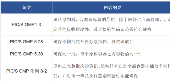 根據(jù)PIC/S GMP法規(guī),我們必需對藥品之原物料進行檢驗,以確保標(biāo)簽、批次、同一性、抽樣,整理如下表: