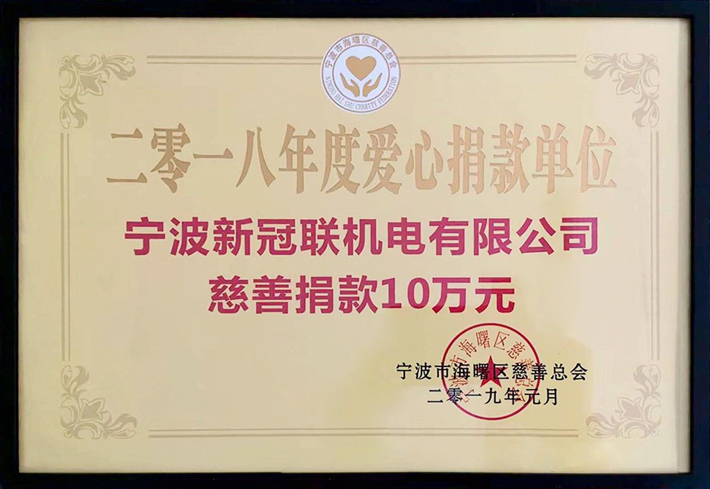 新冠聯(lián)在產(chǎn)品的研發(fā)投入大量的成本,發(fā)展壯大企業(yè)自身的同時,在慈善公益領域也一直默默的踐行著自己的責任,從2018年起每年向寧波市海曙區(qū)慈善總會慈善捐款10萬元,用于慈善事業(yè)的開展。新冠聯(lián)機電一直秉承著服務社會,回報社會的原則,為社會的持久穩(wěn)定發(fā)展貢獻自己的一份力量。