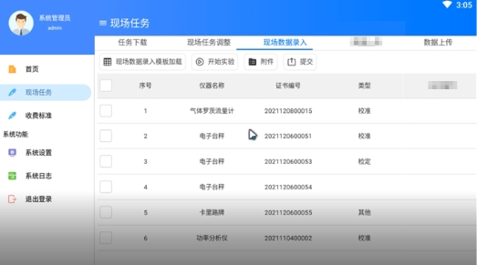 現(xiàn)場(chǎng)計(jì)量人員在系統(tǒng)中完成現(xiàn)場(chǎng)計(jì)量項(xiàng)目、計(jì)量結(jié)果的錄入,包括現(xiàn)場(chǎng)環(huán)境參數(shù)、所用儀器設(shè)備、計(jì)量人員、計(jì)量結(jié)果等相關(guān)信息。